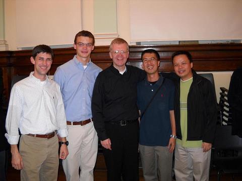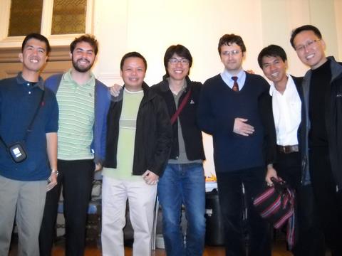 | L-R: Norlan Julia (PHI), MPhil/PhD in theology at Heythrop; Stefan Garcia (PHI/BRI), 2nd year philosophy at Heythrop; Ari Dy (PHI), MPhil/PhD in Chinese Buddhism at School of Oriental and African Studies[SOAS]); John Kim (KOR), 1st year theology at Heythrop; Jarek Duraj (PME/CHN), MPhil/PhD in Buddhist ethics at SOAS; Martin Khiet Pham (VIE), 3rd year theology at Heythrop; and Joseph Kang Ingun (KOR), PhD in Buddhist-Christian relations at Heytrhop. The group wasn’t able to catch Fr Michael Holman when this picture was taken. | This other picture is of Ari and Norlan with Fr Michael Holman, with Matthew and Michael of the New Orleans Province, both studying at Oxford. |