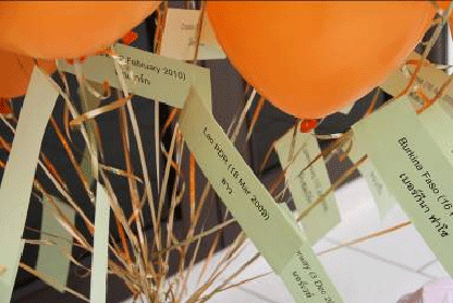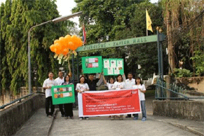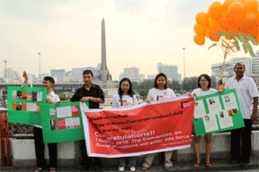 On the 19th of February 2010 the staff of JRS (Regional and Country Office) in Bangkok, Thailand together with friends from Non-violence International and Landmine Monitor Researcher gathered at the Xavier Hall compound and then walked around the Victory Monument with a banner and 30 balloons to celebrate the ratification of the new convention. Of course, it attracted curious onlookers (including the police!). The names of the 30 countries and the dates they had signed and ratified the treaty were tied to the balloons and released at the office area in Xavier Hall.