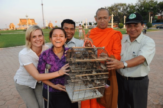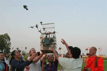 | A group of JRS and friends also released pigeons birds in front of the Royal Palace in Phnom Penh, Cambodia. Second from left above: Ms Song Kosal, Youth Ambassador—International Campaign to Ban Landmines, ready to release the pigeons. |